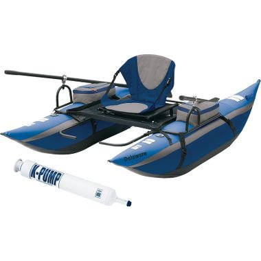 A combo that includes the perfect pontoon for your travels and a reliable pump to inflate it with. The entire boat and oars fit into the included compact rolling storage duffel. Fabric seat rides high for improved visibility. Powder-coated steel frame supports the heavy-duty pontoons. Pontoons have abrasion-resistant PVC bottoms and tough nylon tops. Cold- and heat-resistant bladders maintain air pressure. Fully-padded seat back provides added support. Nonslip footrests adjust to a wide range of leg lengths. Armrest storage includes a large pocket, small pocket, three mesh pockets and cup holder. Fabric rear storage platform and stripping apron with fish ruler. Combination fill/quick deflation valves. Clamp-style oarlocks. Rolling duffel has an adjustable-length pull handle that stows away when not in use. Includes two 6-ft., two-piece aluminum oars. Two-year warranty.Assembled size: 96"L x 55"W x 29"H. Weight capacity: 350 lbs. Weight: 46.2 lbs. The K-100 pump is built with durable ABS to last a lifetime and is one of the simplest and easy-to-use pumps on the market today. It works with most contemporary valves including Halkey-Roberts, Leafield, Boston and Summit valves. Rapidly inflates your pontoon to 3 psi.